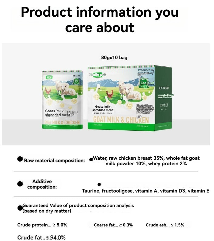 Support your cat's health and hydration with JOY PETS Goat milk shredded pork bun. Made with 63% full fat goat milk and real chicken breast meat, this snack is rich in nutrients and immune-boosting properties. Perfect for picky eaters and kittens with low immunity. Trust in the quality of New Zealand's finest ingredients.